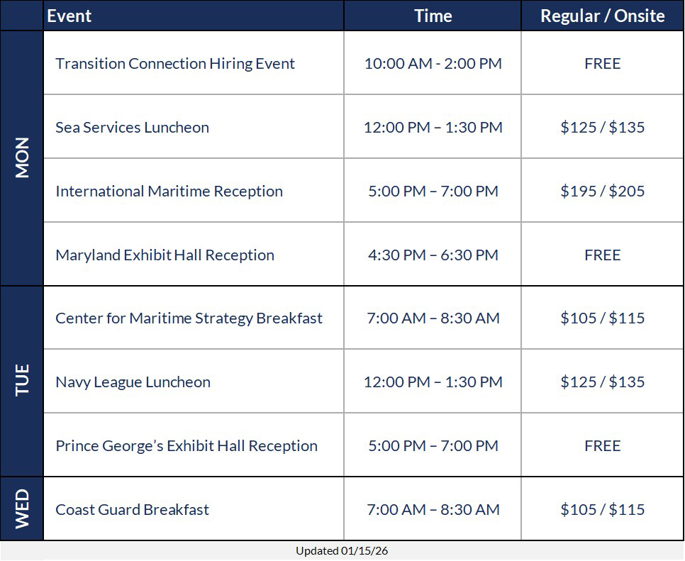 Foreign Military/Embassy/Government may attend Monday’s International Maritime Reception complimentary, by selecting the event on the Add On Events page.